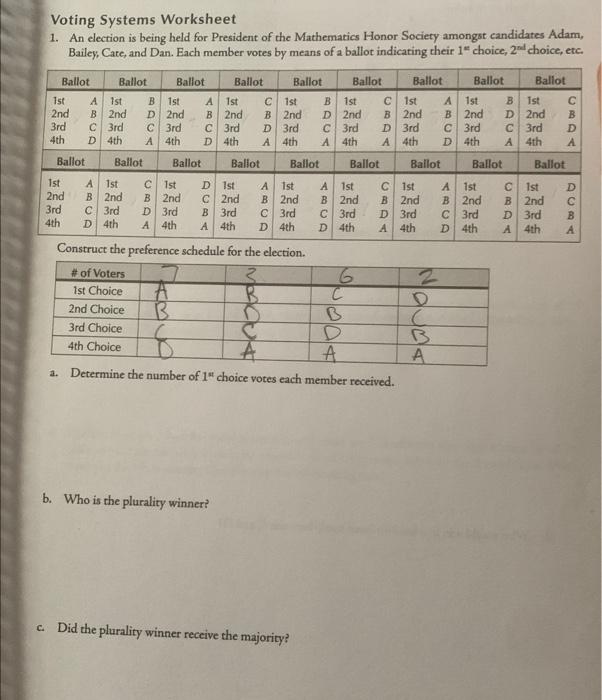CLASSROOM ACTIVITIES - Scholastic WebArticle. How to Create a Culture of Kindness in Your Classroom Using The Dot and Ish. Use these classic books and fun activities to encourage your students to lift one another up — and to let their natural creativity run wild! Math 181 Fall 2018 Worksheet 6 Plurality vote: The winner is the candidate ranked first by the most voters. Which candidate is selected as the winner by the plurality vote? ______. 2. Borda ...